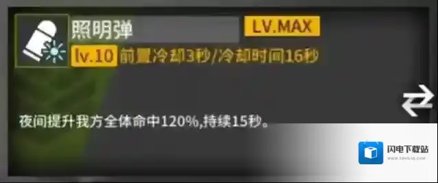 照明弹:夜战提升百分之一百二十命中,持续十五秒。这一技能非常简洁,给全队提升一点二倍的命中率,在数值上提升较大,持续十五秒的时间也非常长。如果进入夜战,提升的命中率非常关键。