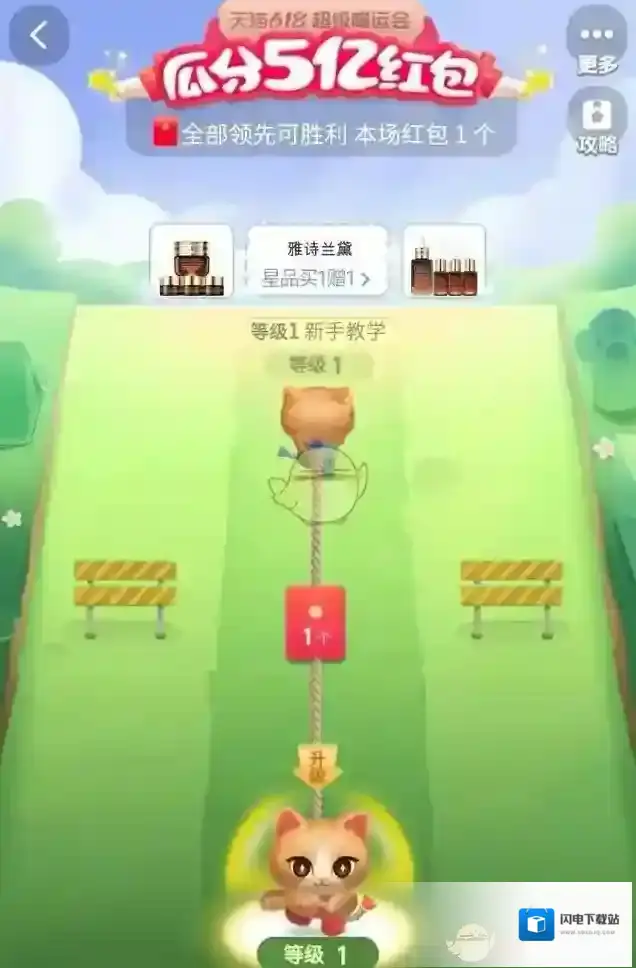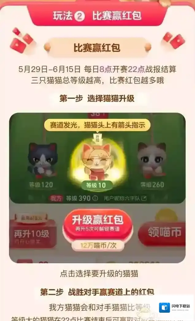 本玩法为比赛玩法,可通过领取喵币,有选择的升级己方的3只猫猫,与对方的3只猫猫分别比拼,每条赛道中等级更高的一方将赢取该赛道中的待兑换红包,3个赛道分别单独比拼。