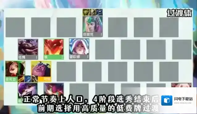 四阶段选秀结束之后达到第八级人口,前期金龙炮打工可以用质量高的便宜英雄来顶住血量。节省下来的金币优先提升人口等级;小炮担当前期输出位置前面宝石携带肉装打工。如果在提升到八级人口找不到金鳞龙羁绊就补上奥恩代替宝石;九级人口阶段单加一个众星之子或者是娜美凑个秘术羁绊。