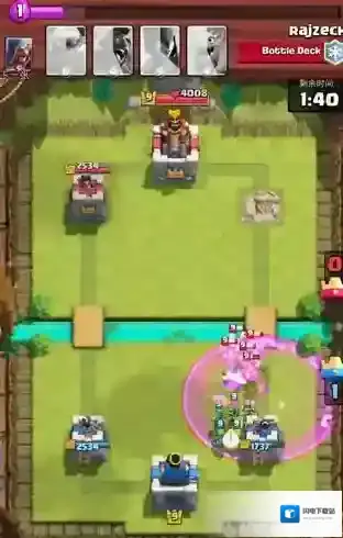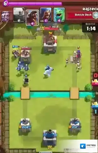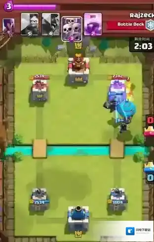 3.对手沉底了一些强力辅助单位准备强攻时,我们可以在另外一路打出强力的组合进攻用于分散对手的卡,如果敌方防守火力不足,很有可能还会掉落一塔。