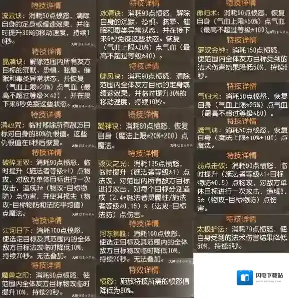特技释放后要冷却6秒才能再次释放特技,不同的特技消耗不同的愤怒值,而愤怒值在战斗中每6秒回复一点,脱战后只能保留70点,愤怒也可以通过特定法宝和药品来即时恢复。