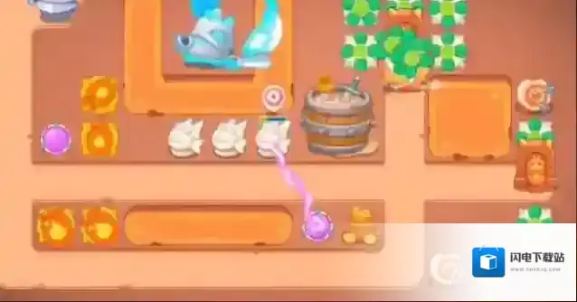 3、清理掉之后,在大桶的位置放上一个火瓶和一个魔法球,在右上角放上两个风扇,锁定上面的特殊障碍。