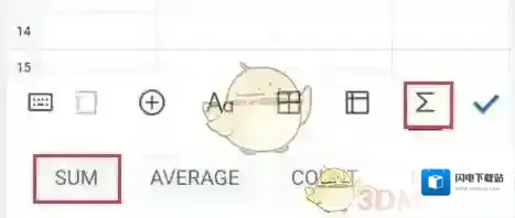 2、双击单元格,在手机屏幕下方找到工具栏,点击工具栏中如图所示的“∑”按钮,再点“SUM”按钮。