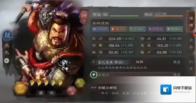分析:典韦的自带战法有着强力的护卫主将效果,在典韦的保护下主将可以持续保持高兵力高输出。虽然典韦的承伤能力并不是十分出众,但是战法的承担效果却无比重要,在搭配强力输出主将时效果最佳。