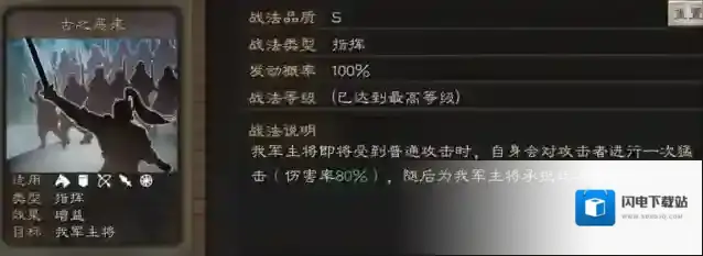 我军主将将要受到普通攻击时,自身对攻击者造成猛击,并为主将承担普通攻击伤害。