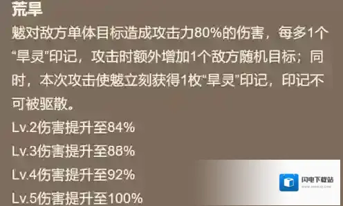 荒旱:对敌方单体造成攻击力80%(满级100%)的伤害,每多一个“旱灵”印记,攻击时额外增加一个随机目标;同时本次攻击可以立即获得1枚“旱灵”印记。