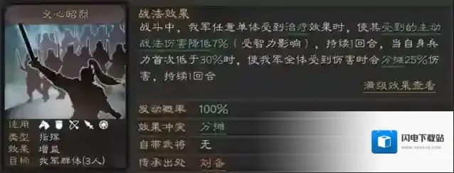 义心昭烈:我军任意单体受到治疗时,使其受到的主动战法伤害降低持续1回合,当自身兵力过低时,使我军全体受到伤害时分摊持续1回合。(配合自带战法相当于每回合稳定群体减伤)