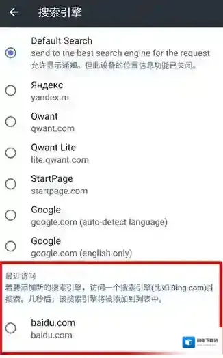 4、最后在最近访问下方,勾选百度为搜索引擎即可。