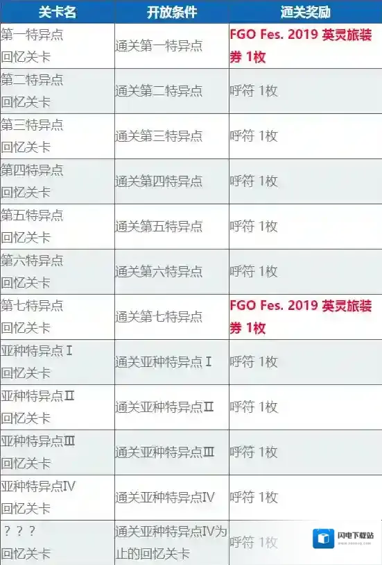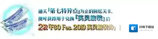 通关第一特异点和第七特异点的「回忆关卡」可分别获得1枚「FGO Fes. 2019 英灵旅装券」。