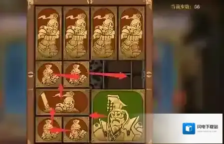 5、将军下移,右上小方块左移,右侧全部上移,下方竖直方块右移一格,其左侧的小方块移动到最下方一排的空格处,将军可以再下移一格。