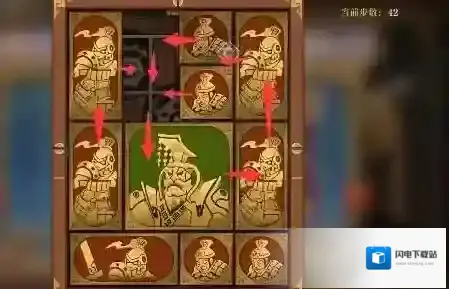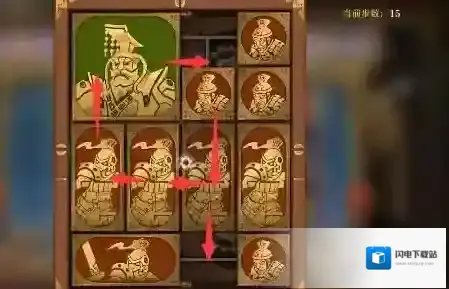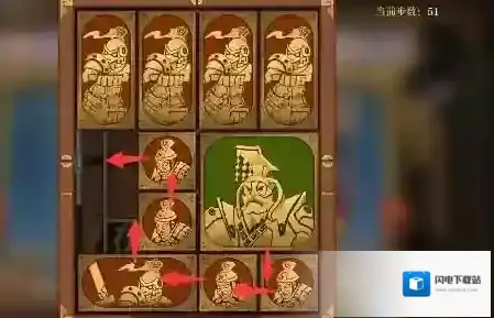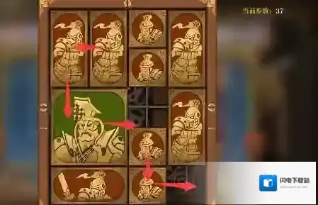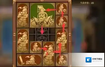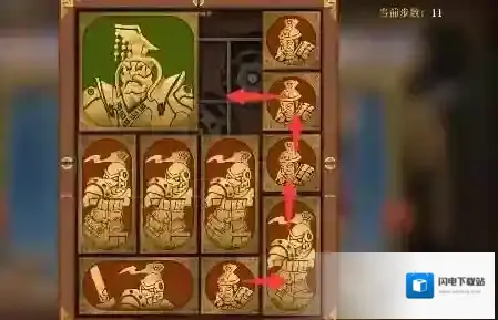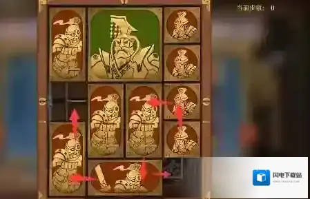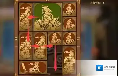 6、将军下移之后上方小方块竖直向右摆放,左上角竖直方块右移,左下的竖直方块上移,将军左移一格,右侧中间小方块左移一格,右下角竖直方块上移一格。