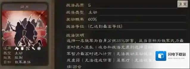 主动战法闭月:选择敌军单体自身分担伤害,且当目标为敌军武力最高使其陷入混乱状态,若目标为敌军智力最高使其陷入计穷状态,否则陷入虚弱及禁疗状态持续1回合。