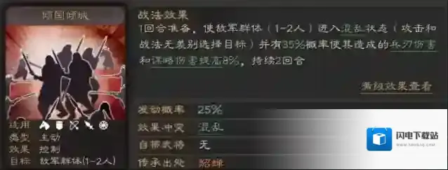 可拆战法主动战法倾国倾城:1回合准备,使敌军1-2人陷入混乱状态,并有概率使其造成伤害提高8%持续2回合。