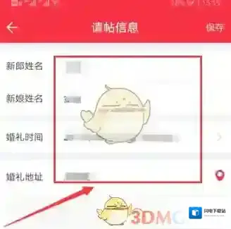 5、请帖信息,输入新娘新郎姓名和婚礼时间、地点,点击右上角“保存”。