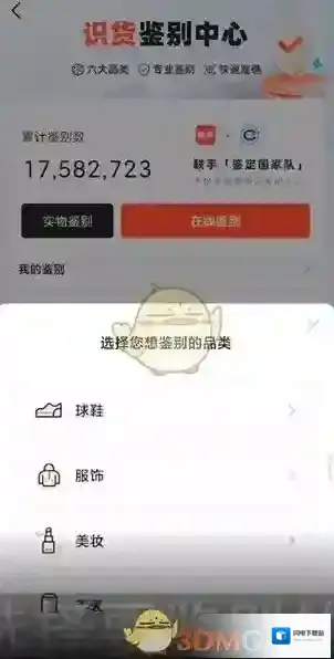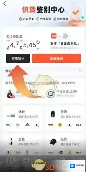 2、在识货工具栏处,点击专业鉴别,选择实物鉴别;