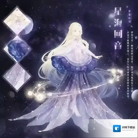 星海回音含正常姿势与特殊姿势,特殊姿势外套“星海回音”,精美可移动摆件“环绕星星”。套装裙摆可拆分,进行单独搭配。海报展示妆容为“月空冥”。