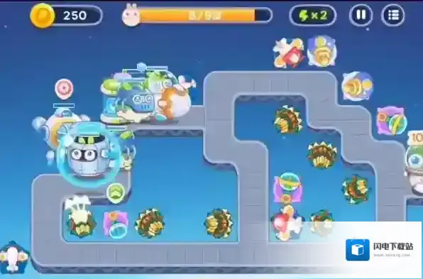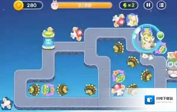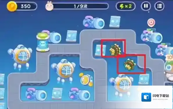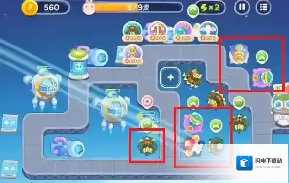 2、第2-3波右上角放个闪电塔和泡泡塔,第4-5波在右边下面放玩具飞机、分裂箭、泡泡塔。
