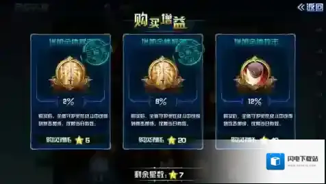 玩家在挑战对手胜利后会得到相应的五角星,根据敌手的挑战难度与胜利结算获得的五角星数量会有不同。五角星累计到一定数量后玩家可用五角星购买增益,增益是芦花古楼中较为独特的玩法之一,因为玩家爬上越高楼层遇到的对手会更加强大,购买增益可以提升玩家全体守护灵的暴击加成、攻击加成、全体防御等数值,从而提升胜利率。