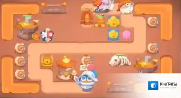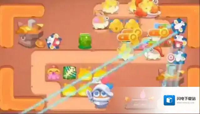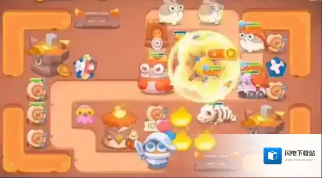 5、等障碍都清理完之后,在中间放置鱼刺,在左边补上一些飞机炮塔,就能轻松守住了。