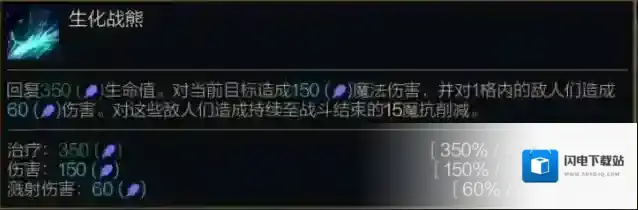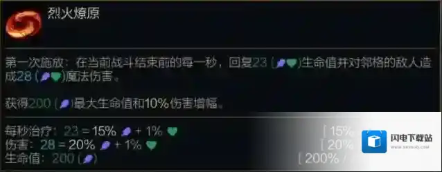 第一次施放:在当前战斗结束前的每一秒,回复(15%/20%/25%法术强度 +1%最大生命值)生命值并对邻格的敌人造成28(20%/30%/45%法术强度 +1%最大生命值)魔法伤害。
