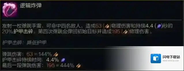 发射一枚弹跳手雷,可命中四名敌人,造成(144%攻击力)物理伤害和持续(4.4%法术强度)秒的20%护甲击碎。第四次弹跳会弹回初始目标并造成(444%攻击力)物理伤害。