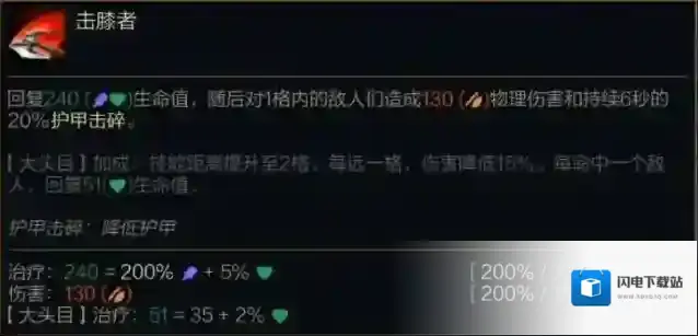 回复(200%/220%/240%法术强度 + 5%最大生命值)生命值,随后对1格内的敌人们造成(200%攻击力)物理伤害和持续6秒的20%护甲击碎。