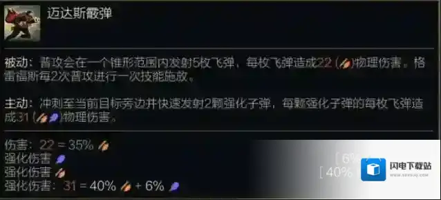 被动:普攻会在一个锥形范围内发射5枚飞弹,每枚飞弹造成(35%攻击力)物理伤害。格雷福斯每2次普攻进行一次技能施放。