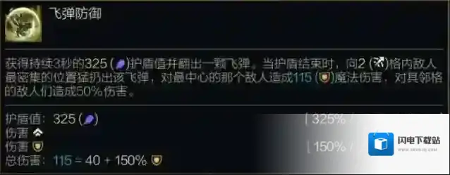 获得持续3秒的(325%/375%/450%法术强度)护盾值并翻出一颗飞弹。当护盾结束时,向2(攻击距离加成)格内敌人最密集的位置猛扔出该飞弹,对最中心的那个敌人造成(40/60/90+150%/225%/350%护甲值)魔法伤害,对其邻格的敌人们造成50%伤害。