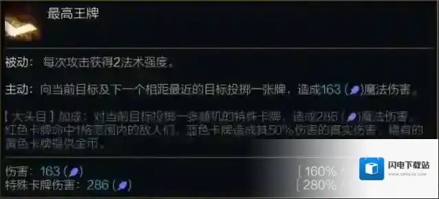 大头目加成:对当前目标投掷一张随机的特殊卡牌,造成(280%/420%/650%法术强度)魔法伤害。红色卡牌命中1格范围内的敌人们。蓝色卡牌造成其50%伤害的真实伤害。稀有的黄色卡牌提供金币。