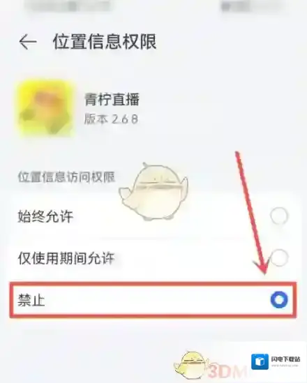 6、进入到位置信息权限设置,选择“禁止”,即可隐藏位置信息。
