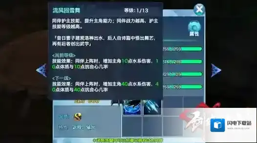 护主技能:流风回雪舞:增加角色水系伤害,体质与抗会心几率。