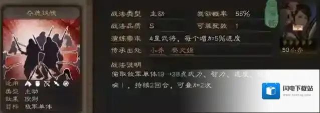 夺魂挟魄可从武将小乔、蔡文姬传承获得,战法可以偷取敌军4维属性为己所用,不仅降低了敌军的强度,还可以加强自身的强度,属性叠加2次后提升幅度也特别恐怖。战法拥有55%的高额发动几率,并且没有任何兵种限制,可以随意配合使用。