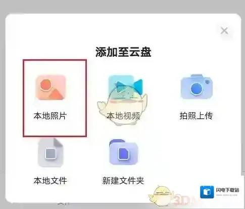 4、点击+号,然后点击本地照片,可将图片上传到阿里云盘,根据需要使用。