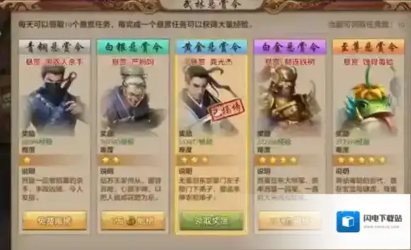 武林悬赏令每日可以领取任务10个,任务分为五个种类。