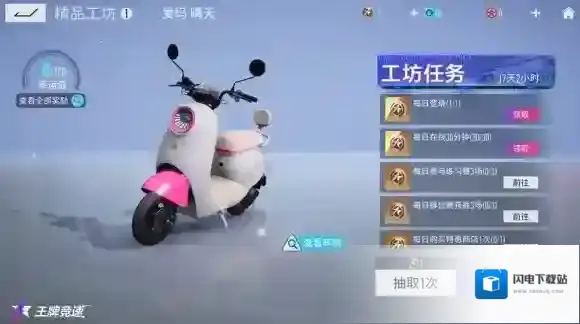 联动期间,车手们可通过参与精品工坊活动获取爱玛晴天。完成每日登录、每日在线、每日参赛等任务,获取精品币,使用精品币进行抽取,即有机会获得爱玛晴天、爱玛晴天蓝图、III级芯片礼包等好礼。进行十连抽可享精品币9折优惠,每次抽取还可增加1点幸运值,幸运值达100时,必得大奖爱玛晴天!