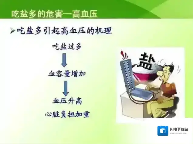 解析:长期过量食用盐,可能会使体内的钠离子水平升高,从而导致心脏负荷过重,导致血压上升。此外,在加工食物过程中,也会添加大量盐、含钠的添加剂等,可能导致血液内的钠离子浓度增加,引起细胞肿胀,导致血压升高。