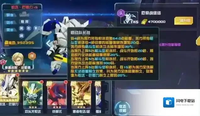 当我方上阵5台格斗型机体时,敢达·巴耶力攻击时获得220点能量,同时我方能量最高的机体回复敢达·巴耶力所回复能量的50%,冷却10秒。