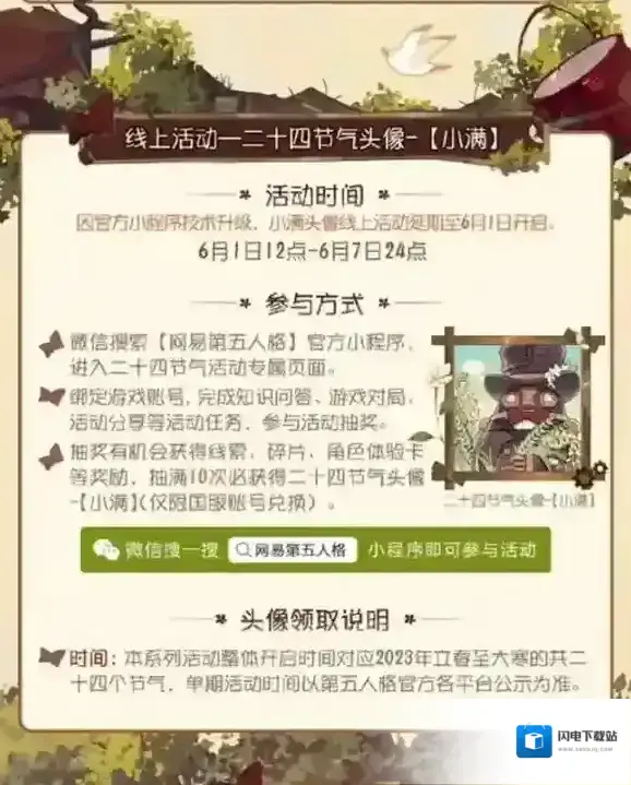 无法参加线下活动的玩家也可参与6月1日12时至6月7日举办的线上活动,通过完成一系列任务将有机会活动二十四节气头像–小满、线索、碎片等奖励,与邦邦共享谷物渐满,繁花飘香的初夏限定美好!