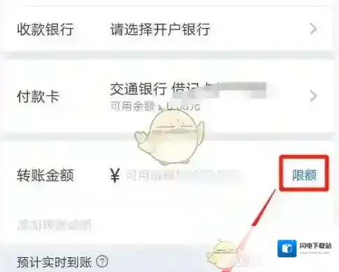 4、进入银行账号转账页面后,找到转账金额选项,点击右侧的限额按钮。