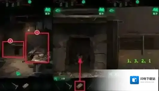 找到门神并进入门神房间后,先拾取靠在床铺上的晾衣杆,然后往左侧看,有一个灶台和一个风箱,这里需要先点灶台,在道具栏选择火柴点燃灶台,然后返回再点击灶台旁边的风箱,按照之前在小卖部窗口用手机看到的提示拉动风箱,看地上有白色粉笔画的标记,分别代表一、二、三,长按风箱把手,拖动到对应的标记位置后松手,视为拉动了一下,依次将风箱把手拉到一、三、二、一的位置,让火生的更旺。