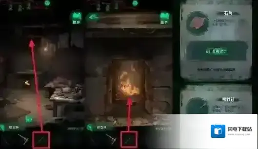 然后在道具栏中选择晾衣杆,再点击灶台正上方房梁上的布娃娃(有小高能),使用晾衣杆点击炉火,获得石片和棺材钉。