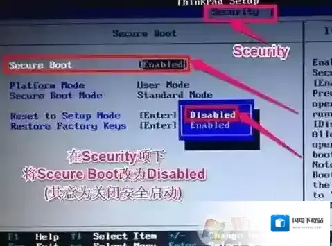 2、按→方向键移动到Security,将secure boot改成disabled,关闭安全启动,如图所示: