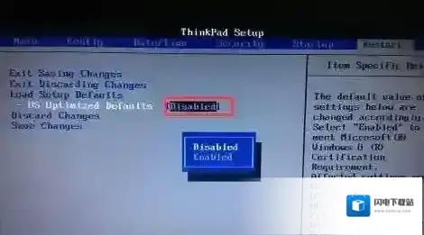 4、在Restart下,选择OS Optimized Defaults回车,改成Disabled或Other OS,接着选择Load Setup Defaults回车进行加载,然后按F10保存设置,如图:
