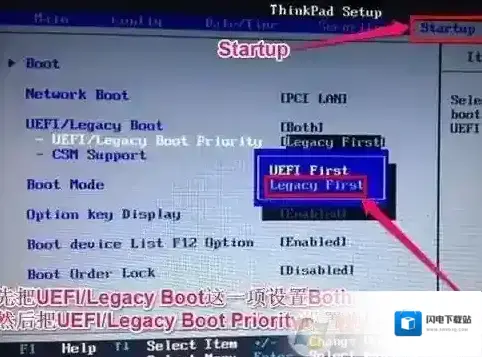 3、选择startup,在UEFI/legac boot priority下,设置为Legacy First(传统模式优先),如图: