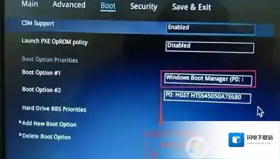 3、继续把boot option#1选项改为普通引导的,boot option#1和boot option#2硬盘启动位置对换,设置第一启动项为普通硬盘引导,带Windwos Boot Manager的为UEFI引导分区;