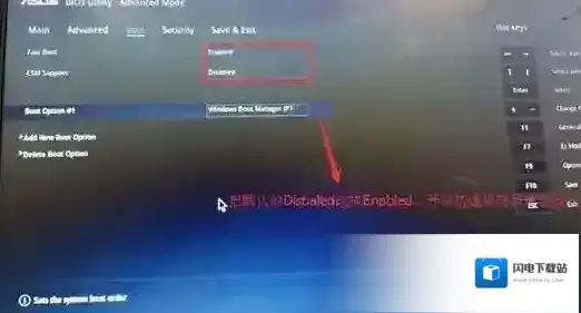 2、重启后切换到BOOT的选项,分别把fast boot和csm support由disabled改成enabled,分别开启快速启动和兼容模式;