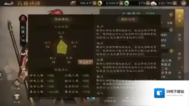 武力94 智力74 统率96 毅力78 运气75