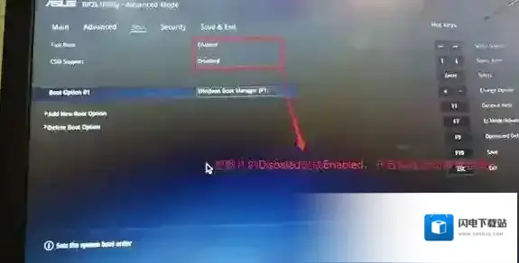 2、重启后切换到BOOT的选项,分别把fast boot和csm support由disabled改成enabled,分别开启快速启动和兼容模式;