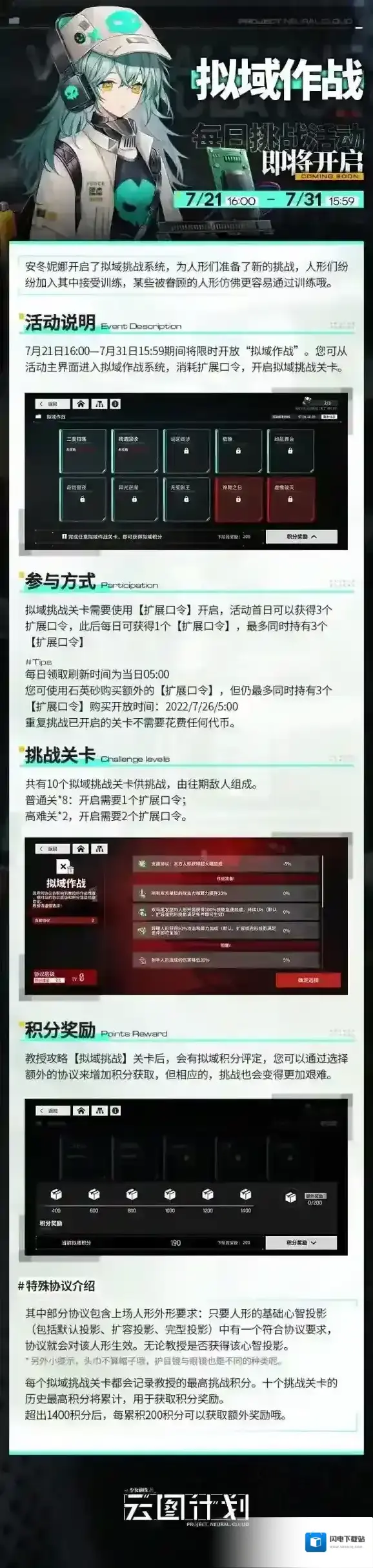云图计划拟域作战怎么玩 云图计划拟域作战玩法说明 2025-09-01 15:20:42 编辑:小辰 分类:手游攻略 • 阅读:181 云图计划拟域作战怎么玩 云图计划拟域作战玩法说明 亲爱的教授,7月21日16:00~7月31日15:59期间将限时开放“拟域作战”!指挥您的人形接受训练,开启每日挑战吧!活动详情请看下图。 少前云图计划手游相关内容 全部 少前云图计划玩法 少前云图计划拟域 少前云图计划作战 少前云图计划 少前云图计划计划 少前云图计划云图 少前云图计划12月8日更新了什么 12月8日更新维护公告 少前云图计划12月8日更新了什么 12月8日更新维护公告少前云图计划计划更新维护公告亲爱的教授:为给大家带来更加优质的游戏体验,《少女前线:云图计划》计划于2022年12月8日 16:00 - 16:10 进行停服维护,维护期间不能进入游戏。详情请看... 2025-06-09 云图计划钢火铸就池子开启 云图计划钢火铸就开启时间 云图计划钢火铸就池子开启 云图计划钢火铸就开启时间开启时间亲爱的教授,11月25日维护后~12月9日15:59期间,定向检索·钢火铸就 将限时开放!开放期间,3星人形伊芙琳出现概率将大幅提升。 2025-06-08 发表回复 请登录后评论... 登录后才能评论 评论列表 (0条)