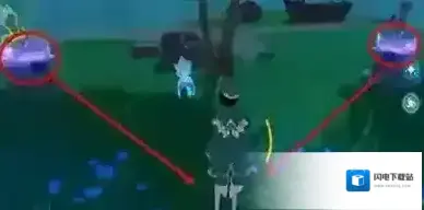 3、第一次,站到下图所示的位置,就是地上蓝色小花的空缺处,同时让两个雷霆探针归位(等待雷元素消退后再移动);